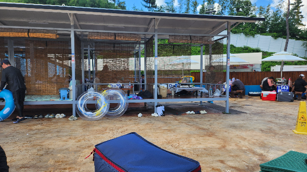 완주 아쿠아워터파크는 테이블이나 카바나를 빌리지 않으면 앉아서 쉴 곳도 없고 음식을 해 먹을 수 없어요,